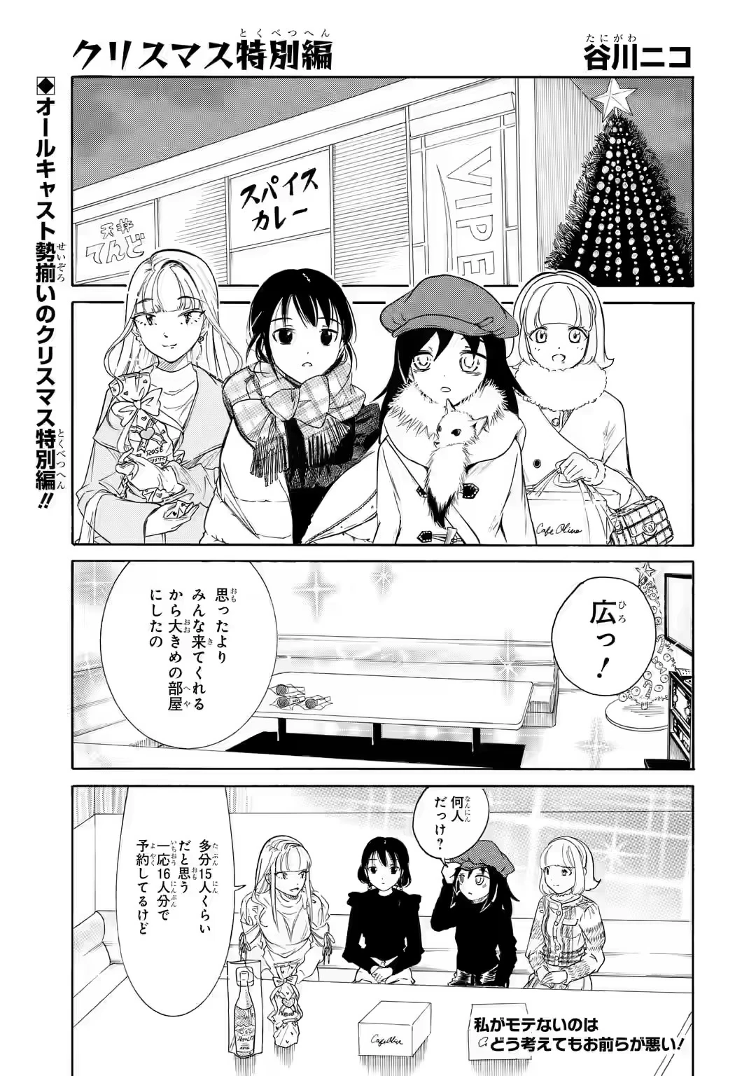 The first panel of the cover reveals a sign for "Spice Curry" outside a restaurant that has a Christmas Tree. Wearing their winter clothes, Asuka, Yuri, Tomoko, and Yū, enter a room in the restaurant. It is large, sparkling clean, and has a karaoke machine with three microphones on the table. One of them exclaims off-panel, "Huge!" The voice of Asuka explains that she reserved a room larger than she expected since everyone is coming.