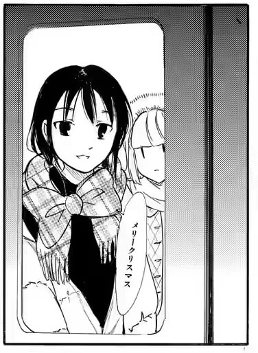 On the train, before the doors close, Akane waves and tells them to take care. Behind her, Emiri wishes a Merry Christmas (メリクリ・meri kuri). Itō stands behind her silently. Yuri sort of reacts with a bit of surprise. The next panel shows her smiling as she looks out the window of the closed door and whispers "Merry Christmas (メリークリスマス・merī kurisumasu)." On the platform, Fūka, standing between Masaki and Tomoko, smiles and waves back.