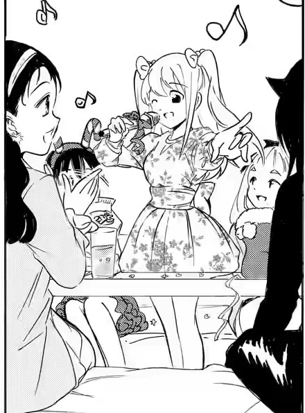 Whilst Yuri sits and nonchalantly fills the shocked Mako's glass with one hand as she sits and munches on another piece of chicken, Hina announces that she will sing next. Masaki, again swigging from a bottle, notices the title of the next song and the singer.[13] She notes that "Tamura" has the same name; Hina corrects her that the singer is "Yukari," and she is a few letters off. From across the table, staring at Hina, Kotomi inwardly concludes that she is definitely an "otaku." Hina begins to sing to the delight of the others. She even strikes a pose.