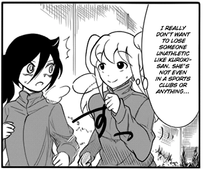 Tomoko then overtakes her. Hina, determined to not lose to someone like Tomoko, puts up a fight. Koharu Minami tells her anonymously drawn and unnamed friend Sachi that she ran so much she may have lost a kilogram. Sachi teases her that she was practically walking. Behind them, Tomoko and Hina crouch exhausted and out of breath. This attractis the unwanted praise from Ogino who makes the rest of the class applaud their efforts. In response to Ogino's praise, Tomoko mutters "Go die in a hole, you bitch!" Hina inwardly notes that that is something they can both agree upon.