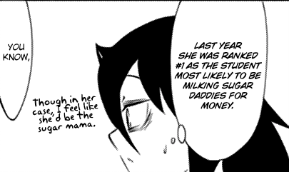Tomoko stammers that she does not think that way anymore, and Katō smiles and thanks her. Inwardly, Tomoko muses that Katō was ranked the student "most likely to be milking sugar daddies," while thinking that Katō would more likely be a "Sugar Momma." Katō continues that she has also developed a different opinion of Tomoko as well: Tomoko is not the "quiet, dilligent girl," she thought she was. They are interrupted by a loud and annoyed sound. Katō whispers that they should start studying hard for awhile. Uchi, sitting next to Kayo, her currently unnamed Black-Haired friend, some distance behind them, angrily grits her teeth.