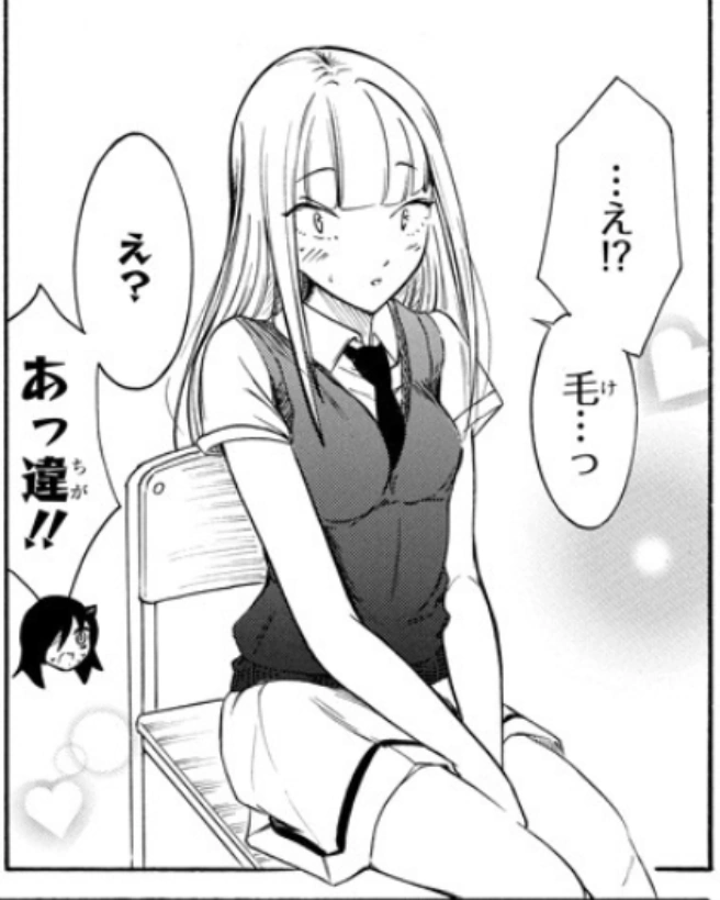 - Hair Apparent: to be fair to Katō, Tomoko does not use the more specific word for hair on the head: 髪 (kami). She instead uses a generic term for "hair," or "fur,": 毛 (ke). Hence she corrects herself with 髪の毛 (kami no ke). The word for pubic hair is 陰毛 (inmō), because WataMote Wiki cares, though in subsequent chapters – Spoilers There be! Arg! – WataGirls will use the term "hair down there" or "lower hair (下の毛・shita no ke)."