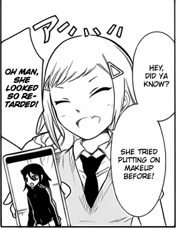 She is interrupted by Minami addressing the two anonymous girls as "Sachii" and "Norii." Nori remarks that Minami should just join their class already. Minami then overhears Uchi explain emphatically that, "Anyways . . ! Kuroki's gross!" and without "gross" Kuroki is not Kuroki, and if the gross was removed, there would be nothing left. Excited, Minami asks her what she is talking about: "You're talking about Kuroki being gross?! Awesome!" Minami then produces a picture on her phone of when Tomoko was made up by Katō.