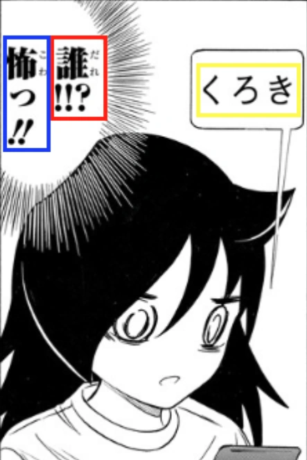 - "Who?!! Scary!!!" – Tomoko reacting to reading the single text of "Kuroki"