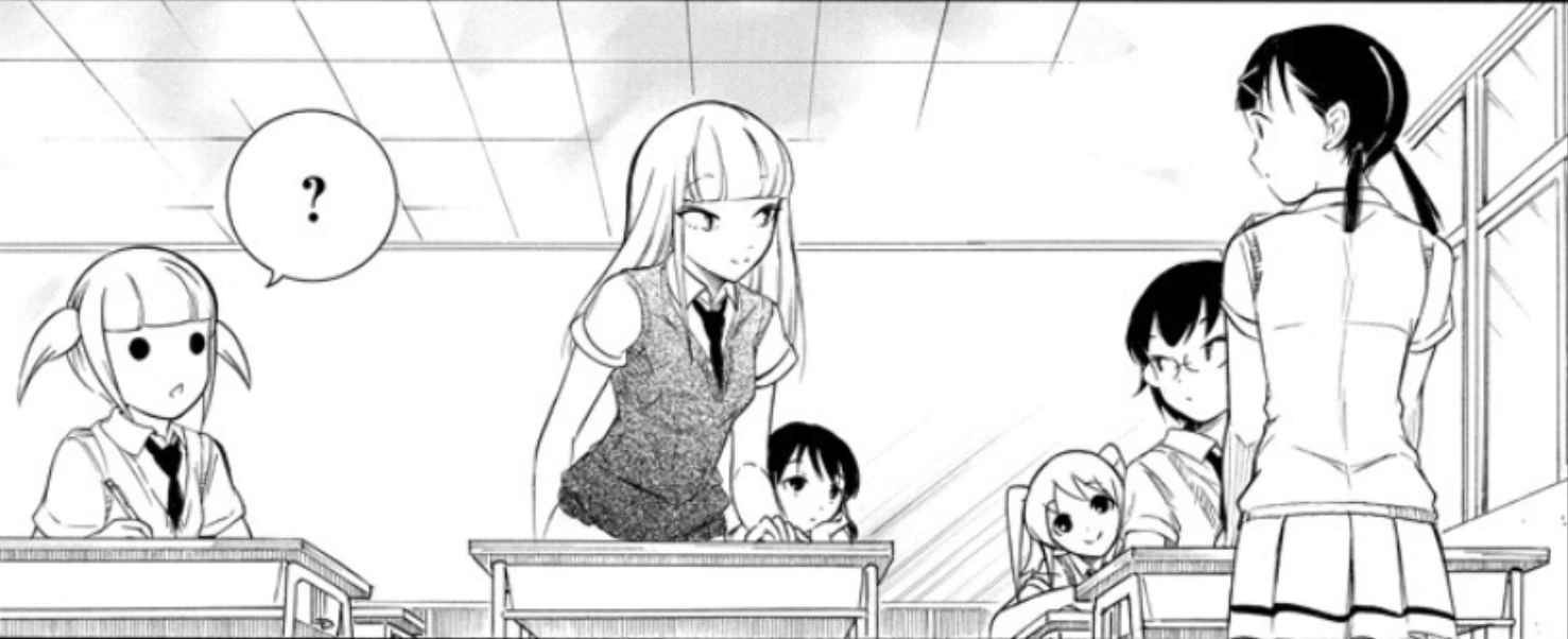 Hina asks her if anything is wrong. Katō smiles and responds that there is nothing wrong while inwardly relieved that she was the only one who received a response. Behind her, Itō informs the sitting Kotomi that she ran into Tomoko the previous day. Kotomi asks her how she was, and Itō responds that she was doing well. Katō turns and looks at Itō with a silent smile, which Futaki, Yuri, Hina, and Kotomi all notice.