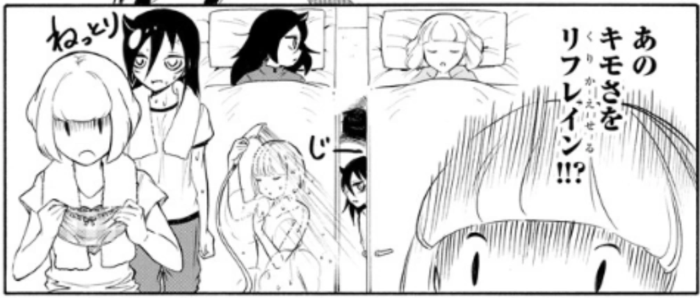 Her mind quickly recalls a montage from the night she shared a hotel room with Tomoko during their class trip to Kyōto: Tomoko staring at her when she sleeps, when she showers, and when she holds her damp panties. Shocked, she inwardly exclaims, "A repeat of that disgustingness?!!"