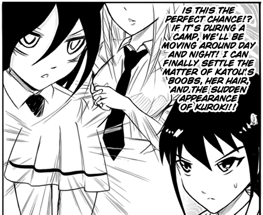 Kaho mentions that she was talking to Fūka about it, and Fūka responded that she might attend as well. As Kaho brings the flier up on her phone to show Katō, Tomoko notices Fūka sternly staring at her. She wonders what "this scummy bitch" is staring at, then suspects that she is thinking about the foliage decorating Katō's Road to a Christening. For her part, Fūka grouses about Katō and Tomoko coming as well. In a montage WataMote Wiki can only add but not describe, Fūka believes the camp will be her chance to settle the matter of Katō's front court, her back court rosebushes, and why Tomoko has suddenly appeared. Fūka announces that she will join the camp.
