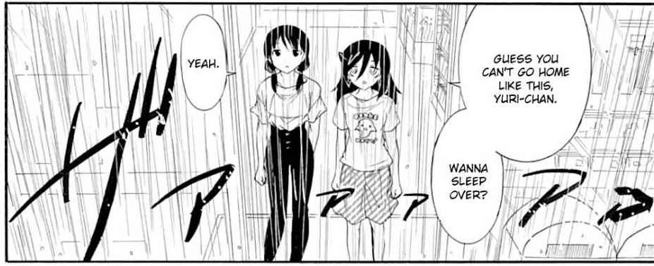 They arrive at the convenience store and spend some time looking at manga. When they look outside, they see that it is raining heavily. Tomoko suggests that Yuri cannot go home and invites her to spend the night at her home. Yuri accepts. As they start to shop, Tomoko observes that things really do happen on typhoon days. She then asks Yuri if they should buy some spare panties. Yuri reveals that she already brought some. Surprised, Tomoko asks if Yuri knew this would happen. Yuri replies that she brought some just in case.