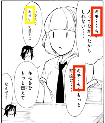 Asuka comes up behind her and forces her to straighten her back to make her voice clearer. Emiri tries to suggest that there is not enough "disgusting," but again stops at the first two syllables (キモ・kimo) to convert it to "feeling (キモち・kimochi)." An irritated chibi Tomoko tells her to just say "disgusting (キモい)," and Emiri complies and tells her to convey her disgustingness more.