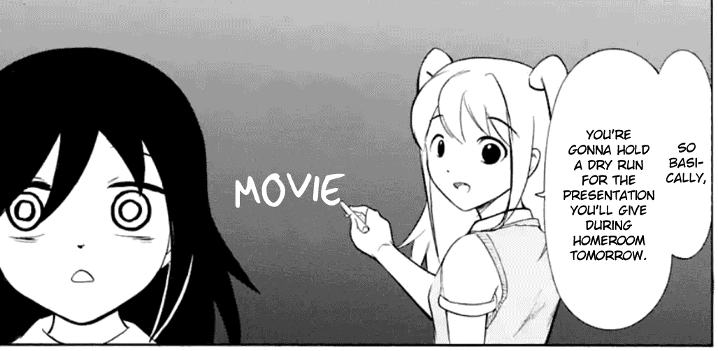 In a classroom, Tomoko stares out in shock. Behind her, Hina writes "movie (映画・eiga)" on the chalkboard as she explains that they are going to do a dry run of Tomoko's presentation. Tomoko looks out at Uchi, Asuka, Akane, Yuri, Mako, Hikari, and Kotomi looking back at her seated in the classroom as Hina explains that she can do it for them, whom she found studying in the classroom. Tomoko asks her what this is, and Hina explains that in order for her to do well tomorrow, she will practice. She rhetorically asks Tomoko to confirm that she cannot do it suddenly. Chibi Hina then encourages her that if she incorporates everyone's feedback, she can improve.