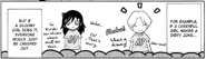 Yuri and Hina sit in class. Hina asks Tomoko if she already has an idea for a movie. Tomoko haltingly replies that she does, "at the moment," and Yuri offers that she already heard. When Chibi Hina asks what it is like, Chibi Yuri responds that while she really does not want to do it, she thinks it is not bad. Chibi Hina then asks Chibi Tomoko what it is about. She responds that she is not sure that she can do it, and Nico Tanigawa decides to keep her plan hidden for now with the next panel showing a blushing Tomoko conclude her description to the seemingly concerned Hina, and she asks Hina if it is too difficult. Hina insists that she was just surprised at how much better it is than she imagined. She then encourages Tomoko that she should be fine to present it at the long home room the next day. She then excuses herself as Kotomi and Hikari arrive. Before she can leave, Tomoko asks Hina if she can present it instead. She explains over an example of a Chibi Miho and herself, a cheerful girl can tell a dirty joke, she will get laughs, whereas if a gloomy girls does it, everyone will be creeped out. Therefore, Tomoko reasons, she thinks they will get more classmates interested if Hina does it rather than her. To herself, Hikari repeats the phrase "creeped out."