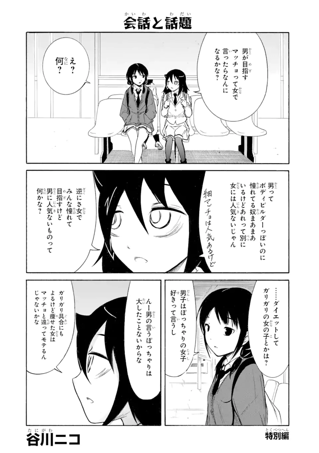 Tomoko sits nexts to Yuri after school at the train station. Behind Yuri, an unidentified female student sits alone. The cover page has the smaller title "Special Edition (特別編・tokubetsuhen)." Tomoko poses the question to Yuri that if boys want to be "macho (マッチョ・maccho)," what do girls want to be? The question surprises Yuri. Tomoko continues that while quite a few guys will strive to become body builders, they are not very popular with women. She adds that the "slim, macho types (細マッチョ・hosomaccho) are, though."
