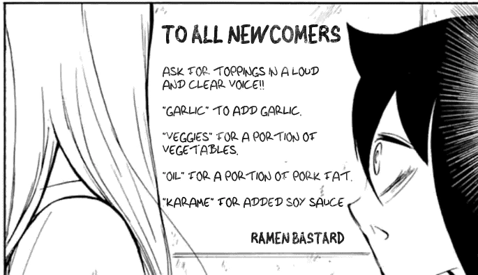 They arrive at "Rāmen Bastard" (ラーメン野郎・rāmen yaro).[2] Tomoko again inwardly marvels at a rāmen restaurant that has a long line. Still inwardly marveling, Tomoko marvels, inwardly, at these unique but troublesome rules. As Tomoko stares at the rules, Asuka, inwardly marvels worries that she came to this shop recommended by Fūka for Tomoko's benefit, but she does not appear happy about it. Standing in front of two signs, one of which forbids taking photographs and videos and the other of which encourages kindness to pigs, Fūka announces that there are some open seats, and she suggests that they enter and purchase their tickets. She enters followed by Asuka and Tomoko. An Anonymously-Drawn Worker happily reminds them to purchase their tickets. Before Emiri can enter, however, another Happy Anonymously-Drawn Worker informs her that they can only take the first three, which elicits a "Why?" whine from her.