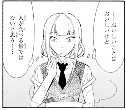 - "That gorilla will definitely eat everything on her plate, so there's no way I can let myself be the only one to not finish!" – Tomoko about Fūka Sasaki