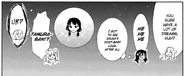 The group walks. In the front, Fūka strides with confidence. Tomoko and Asuka follow. Behind them, Yuri walks with her hands on her hips looking up with her bangs obscuring her eyes. Hina walks next to her looking concerned. Finally, Emiri follows with her head down. Fūka happily declares that it has gotten dark. Still "sparkly," Asuka agrees. Hina looks with more concern at Yuri whilst Emiri has a frown. The next panel cuts off Yuri with Hina looking back with greater concern. A Chibi Asuka asks "Tomo-chan" if there was a different ramen place she wanted to visit. Chibi Tomoko replies that the place was one she had wanted to visit. Normal, she then confesses that it was her dream to walk with everyone on a night like this. In a panel WataMote Wiki cannot adequately et cetera but will place in the Gallery, Chibi Asuka, happily, declares that she has a lot of dreams. Chibi Tomoko sheepishly laughs in response, but she things she did at least see Asuka's post-emesis appearance.[4] Chibi Yuri's face looks stunned as it appears in front of the full Moon surrounded by Asuka's Post-Emesis Sparkles™ as Frightfully Concerned Chibi Hina calls out her name. For her part, Chibi Emiri achieves a new emoji face as she either emits a belch or commences the process of acquiring Asuka's Post-Emesis Sparkles™.