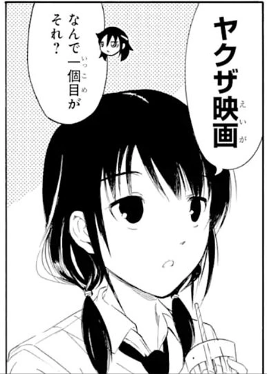 Yuri suggests "Yakuza film." Chibi Tomoko marvels why that would first come to Yuri's mind. Yuri then suggests a "delinquent (ヤンキー・yankii) film." Tomoko replies than only Yoshida-san could star in it. Chibi Yuri then suggests horror, suspense, mystery, war, and documentary. Chibi Tomoko concedes that a documentary could work. Yuri then suggests as a question a documentary about Masaki. Chibi Tomoko angrily retorts that they would just be a delinquent film. Chibi Hina confesses that she is not sure what she means by a documentary, but she then notes that it is a trend to film things in a "professionalish (プロフェッショナル風・purofesshonaru fu) way." Emiri listens intently as Tomoko asks if Hina is suggesting a parody of that.