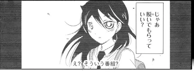 The narrator asks how she can be so stoic (ストイック・sutoikku) when it comes to her grossness. Without turning, Tomoko responds to the narrator that, to be honest, she never considered herself to be "gross," and adds the kanji for laughter (笑). As she turns towards the camera, Tomoko hears the narrator ask, "Then could you take it off?" Tomoko flatly asks if it is that type of program.