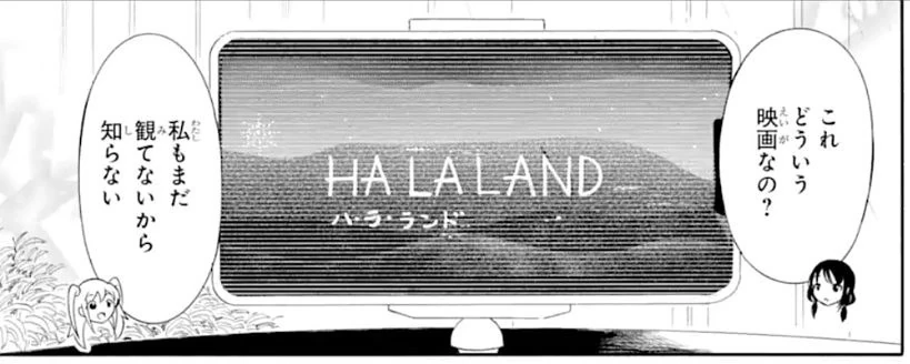 There is a view of mountains with the title "HA LA LAND" in English with katakana below it. Chibi Yuri asks what kind of film it is, and Chibi Hina cheerfully responds that she does not know since she has not seen it yet. An anonymous boy stands with his arms folded. There is a narration that begins "it seems to be." There is no further sound. Chibi Emiri complains that she cannot hear it very well; Chibi Hina replies that the volume is on maximum. The movie scene shifts to two anonymous girls who stand silently. One speaks to state that they need ten more "members." Chibi Tomoko notes that there seems to be a weird pause whenever a scene changes. Hina suggests that the students did not have a clapper board like the professionals, so they did not know when a scene started.