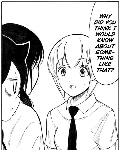 Masaki approaches Mako from behind. She calls to her, and Mako turns and acknowledges her. Looking serious, Masaki claims that a little while ago, Reina and Anna were talking. "They talked about 'raw,' 'rubbers,' and 'XXXX.'[5] Do you know what those mean?" Mako emits a shocked "E!" Masaki touches her hair, looks away, and sweats a bit in embarrassment as she claims that she certainly knows about such things, but, that time, she did not know and rhetorically asks that Mako knows about it.