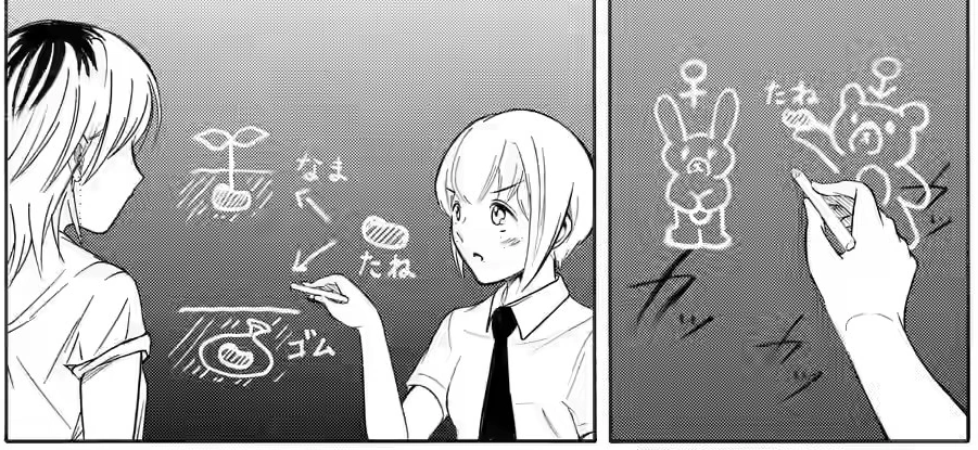 The concluding panels appear without dialogue. Mako draws on the chalkboard a female bunny with the ♀ symbol over her and her paws chastely crossed before her "Road to a Christening." A male bear, with the ♂[6] over him, appears to offer her a large bean with the caption "seed" (たね・tane).