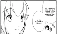 Fūka interrupts her musing to ask her if what she means by a "coffee cup ride," is that it the "one that goes round and round." Miyazaki replies that it is, and she then adds that if they can work out a proper design, they should be able to build a prototype by next week. A normal Miyazaki smiles as she listens to a Chibi Reina ask Fūka what their class will do. Chibi Fūka replies that she does not know, and she asks Reina if she has any ideas. Reina replies with "hookah bar."[2] Fūka eagerly declares that it sounds great and novel. Reina notes that she really is a moron.