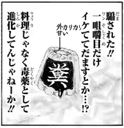 With her Tray of Death™ now empty, Mike chastises her boyfriend for taking them. Kakkun apologizes as he struggles to chew. Tomoko continues to marvel that either he is a self-sacrificing spirit/god as a shitty meal[8] girlfriend's boyfriend, or he is just her boyfriend and has a poison tolerance. She watches Akane struggle and swallow: "She gulped?!!" With tears in her eyes, Hina nervously watches Akane. Also with tears, Akane struggles mightily to brightly announce that it appears that it will be difficult to continue today, so they will continue tomorrow. Sweating, Yoshinori immediately agrees.