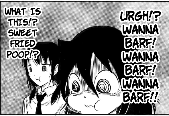 With a look of concern, Tomoko munches. Inwardly, Tomoko wonders that she does not know what it is: "It's kind of sweet and crunchy. It's kind of sticky on the inside, what the fuck is it SHIT?!" She becomes flushed as her eyes swirl. Next to her, Yuri similarly munches with effort. Regarding the "treat" [Citation Needed – Ed.], Tomoko inwardly rages, "I've been tricked!!" with just the first bite. In her imagination, Mike's Offering [of Doom. – Ed.] has a sweet outer covering, but inside is "shit (糞)." "Not your cooking, your poisoning has improved, right!!"