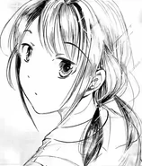 Continuing in Tomoko's imagination, Yuri becomes a sketched manga heroine looking back wistfully. Next to her, the narration reads: "Tamura Yuri, the most beautiful girl in the school, with a combination of talent, beauty, and good conduct." Tomoko continues her discourse, "Even Yuri-chan, a sullen, gloomy, violent woman . . . . . . if you put in that type of monologue, you can make that kind of character at once." Sheepish Chibi Yuri demands to know what she is talking about.