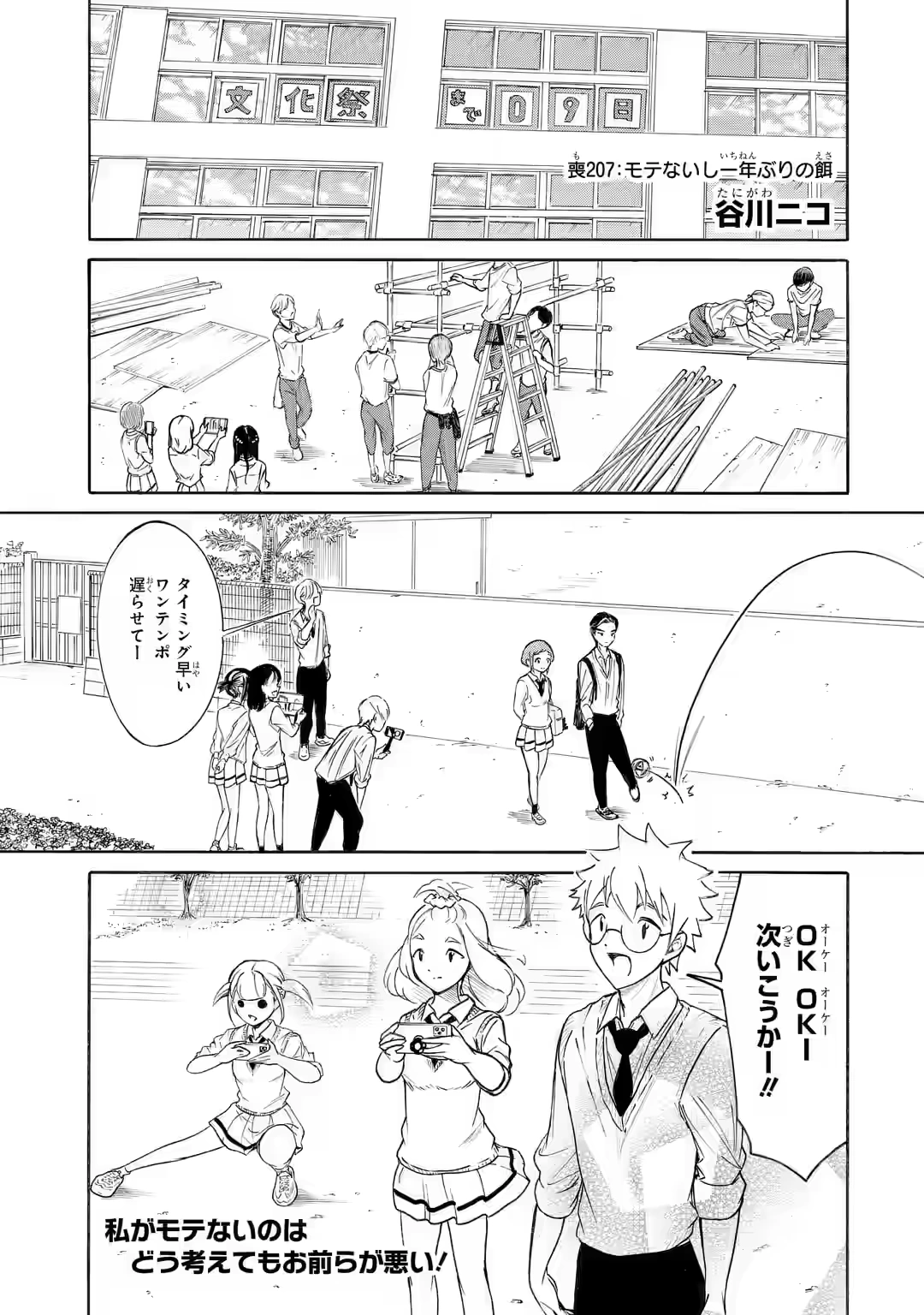 The window sign reads nine days until the festival. Various students work on a scaffold outside. In the next panel, the Oka walks next to a boy who kicks at a ball that lands at his left foot. An anonymous boy behind them shouts out that the timing is fast and to delay it one beat. Shiki films from a crouch. In front of her Akane also films while Yoshinori shouts back acknowledgement. Oka's two unnamed friends Girl with Left Ponytail and Not Sachi-Chan also film from a tablet.