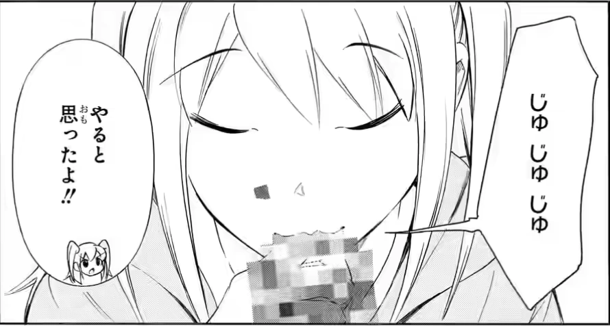 Shiki moves the band of pixels up to cover Hina's eyes on the screen. Chibi Hina protests that it is not her face but the sound and asks if she could just mute it. Chibi Tomoko insists that since it is her best performance, she does not want to alter the sound as much as possible. She explains that she still wants people to watch her as a voice actress[8] and hear her uncensored. Hina insists that something about the way Tomoko says "uncensored" sounds like it means something else.