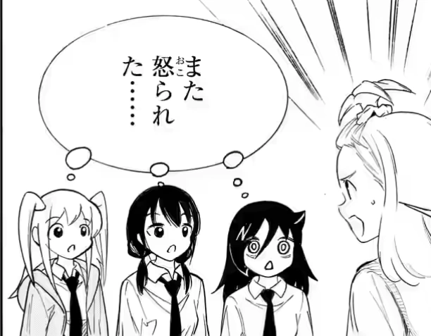 Animesque lightning flashes behind the stunned trio, and Tomoko inwardly marvels that she is more pissed off than she imagined. Blushing and fidgeting, she turns to Hina and stammers to "Nemoto-san" that she knew they could not do that and suggests they reshoot. Hina screams a "HA?" Before a stern Ogino, Angry Chibi Hina protests that she did as "Kuro" directed her; Blushing Chibi Tomoko stammers that she did not think Hina would go so far. "SCUM!"[2] Angry Chibi Hina retorts.