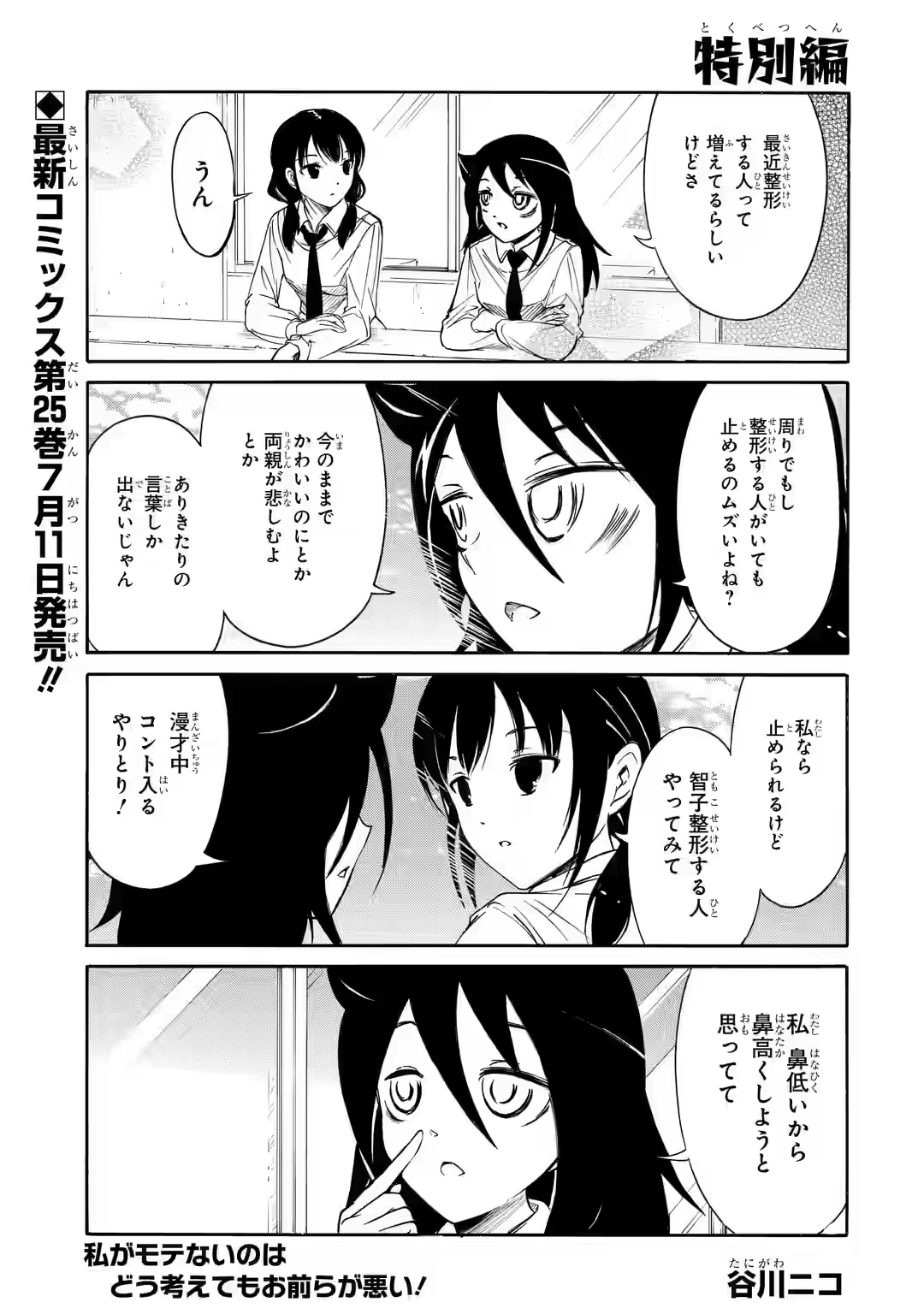 Emiri enters the balcony saying, "Plastic surgery is absolutely forbidden." Tomoko reacts with shock and sweat: "OO?! You could stop it?" Emiri matter-of-factly responds that plastic surgery will only result in giving "Kuroki" a "plastic surgery face (整形顔・seikeigao)": "Both gross and gross, they are Kuroki's personality."[4] Tomoko retorts that the ways she says it, it is just "キモい." In a view for which Gallerys exist, Chibi Tomoko observes a post-plastic surgery Emiri with indicators pointing to her modifications. Tomoko asks if they modify "Uchi-san" is she not still the "original Uchi-san?"