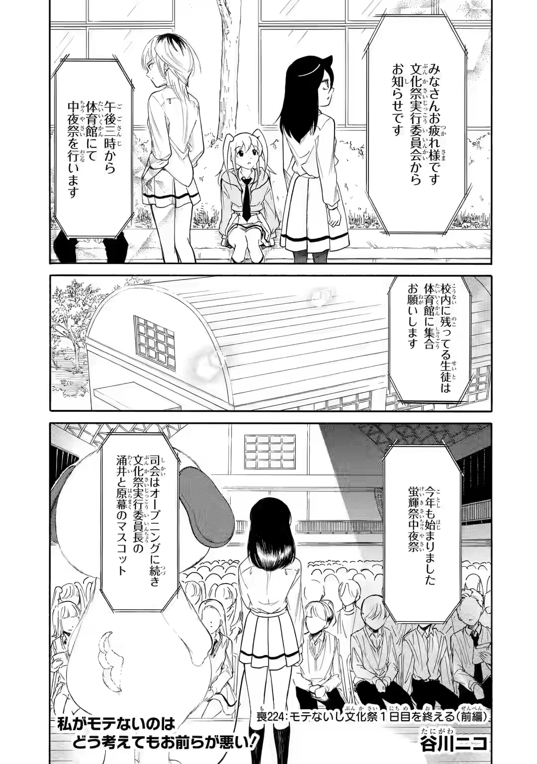 This chapter is a multi-part chapter that follows directly from Chapter 223. The cover depicts Tomoko standing before the bench listening to an announcement. Hina sits on the bench and looks up in the same direction. With an empty space between then, Tomoki sits, probably with his I'm in PAIN! Face, but he is obscured by the announcement's speech bubble. Masaki appears to stand looking down at him seriously.