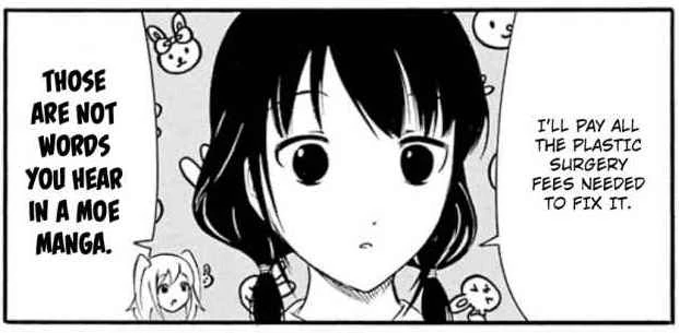 Yuri calmly apologize to Tomoko and notes that she normally does not try to hit a person in the face, but Tomoko interrupts her to agree that even "Yuri-chan" would not smash in her face. Still bleeding, Tomoko assures her that since they are in a moe manga, she will be fine in the morning. Hina insists that since her nose is broken, she needs to see a doctor. Yuri offers to pay for any plastic surgery, which Hina deems are not words you find in a moe manga.