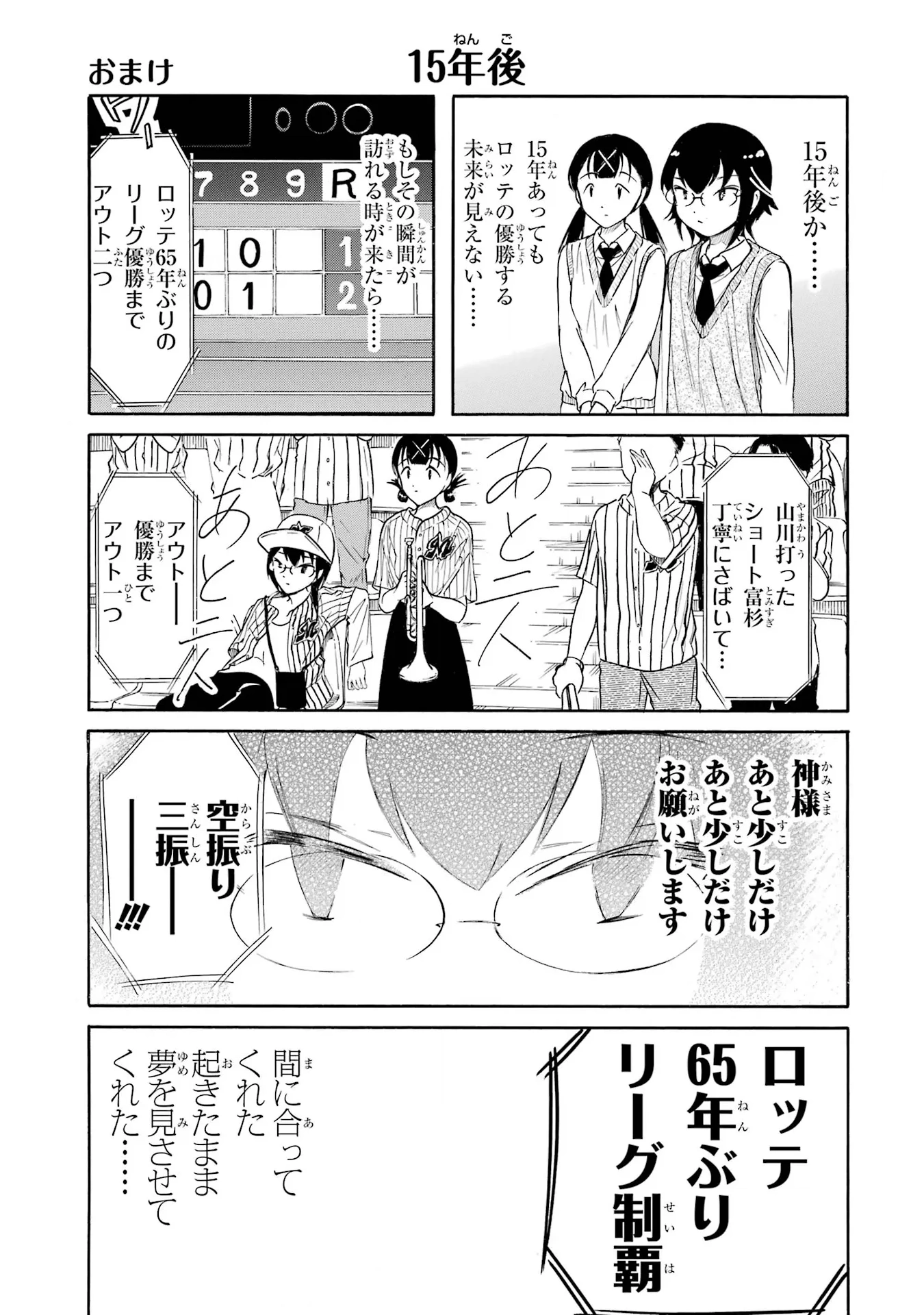In their high school uniforms Kotomi stands with Hikari, and Kotomi think, "15 years after. . . .? Even after 15 years, I can't see Lotte winning the championship. . . . Her narration continues over a view of a baseball scoreboard where it is the top of the ninth inning with the home town team winning 2 to 1: "If that moment should ever come. . . . Her thoughts are interrupted by the announcer declaring, ”Lotte is two outs away from winning its first league championship in 65 years."